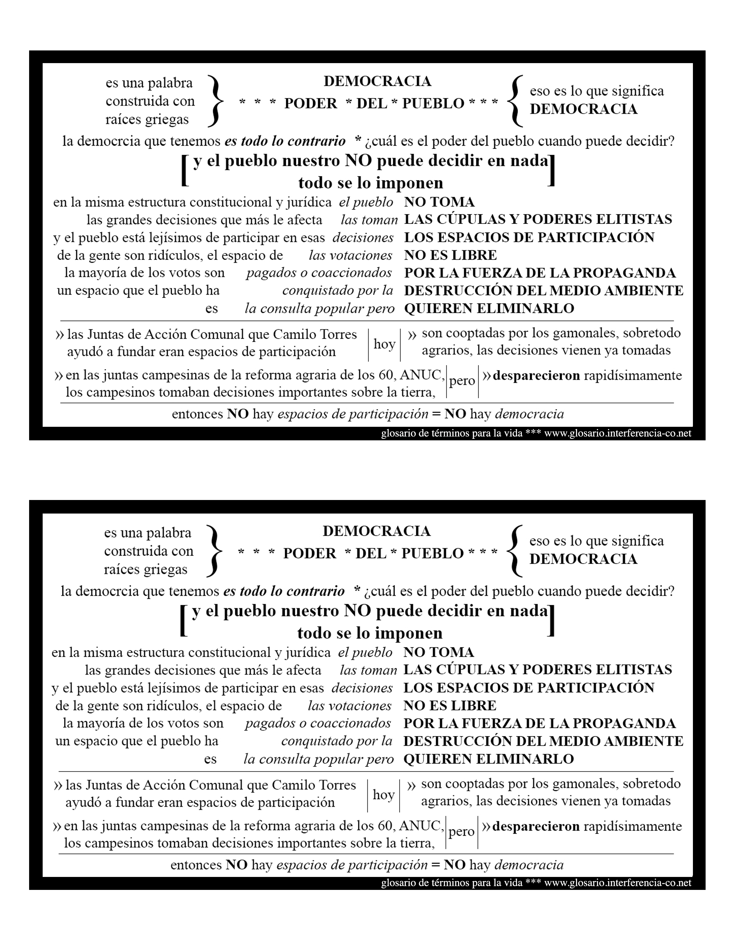 traducido por Javier Giraldo Moreno S.J. Jesuita y valiente defensor de DDHH inspirado en Camilo Torres Restrepo y la Teología de la Liberación, fuertemente perseguida por la iglesia católica. La corrupción del aparato judicial colombiano lo hace utilizar herramientas judiciales para denunciar abusos de las fuerzas militares, delincuentes y paramilitares sobre comunidades ; integra el Centro de Investigación Popular Programa por la Paz CINEP-PPP, donde se sistematiza información relacionada con el conflicto armado, la paz, luchas sociales y protección de DDHH integrales; con testigos, crea allí el Banco de Datos de DDHH y Violencia Política, que recopila información no judicializada sobre crímenes a campesinxs, defensorxs de DDHH y militantes de la unión patriótica; con ayuda de integrantes de la iglesia católica y defensorxs de DDHH, funda la CIJP (Comisión Intereclesial de Justicia y Paz) para visitar escenarios de masacres, salvaguardar la memoria de las víctimas y hacerla conocer. La comunidad de paz de San José de Apartadó, es una de sus principales luchas; población campesina que se declara neutral frente al conflicto armado y rechaza la presencia de todos los grupos armados en su territorio.