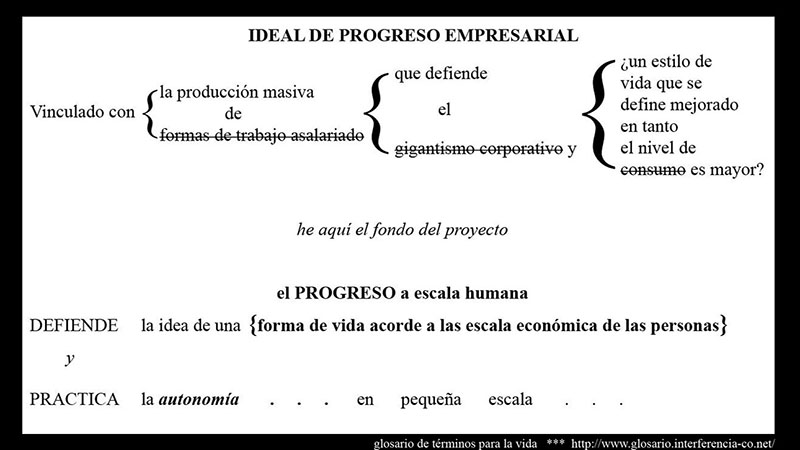 retornar al menú de glosario de términos {... para la vida ...} ideal de progreso El ideal de progreso empresarial está vinculado con la producción masiva de formas de trabajo asalariado, que defiende el gigantismo corporativo y un estilo de vida que se define mejorado en tanto el nivel de consumo es mayor. El progreso a escala humana, defiende una forma de vida acorde a la escala económica de las personas y que practica la autonomía en pequeña escala. *No se trata de pensar el glosario como un esencialismo de palabras especializadas, “antigua lucha amarrada a un obsoleto lenguaje esencialista” (Sholette:2010,118), en el arte, el discurso se ha situado siempre desde una única verdad desde la individualidad del autor; por el contrario, aquí se da la voz a los contextos sociales, para que desde sus prácticas se definan las formas de operar, los intereses que están en juego, y las maneras de interacción y participación con otros y otras y el contexto y las circunstancias que mueven a estas colectividades a actuar.