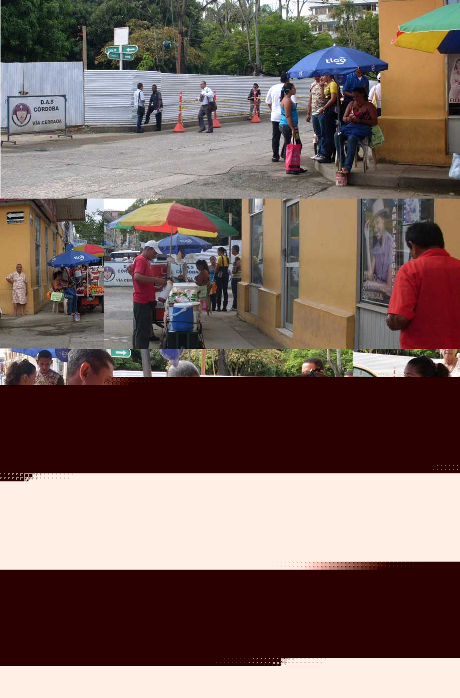 Mi emplazamiento está ubicado en la calle 28 con carrera segunda, todos estos personajes ambulantes de las esquinas estaban dentro del cerramiento que hay allí. Ese es el parque de Bolívar sitio donde concurren todos los monterianos durante el día, ya sea para ir de compras, al trabajo o simplemente para ver pasar la gente. Allí esta Alinson quien trabaja de 8 am. a 8 pm. Vendedora de minutos, oidora de quejas y reclamos, de citas concretadas, de mentiras piadosas, discusiones, alegatos y al final, después de 245 minutos de conversación pagando $52.000 concluyen diciendo... te amo un beso y hasta luego...