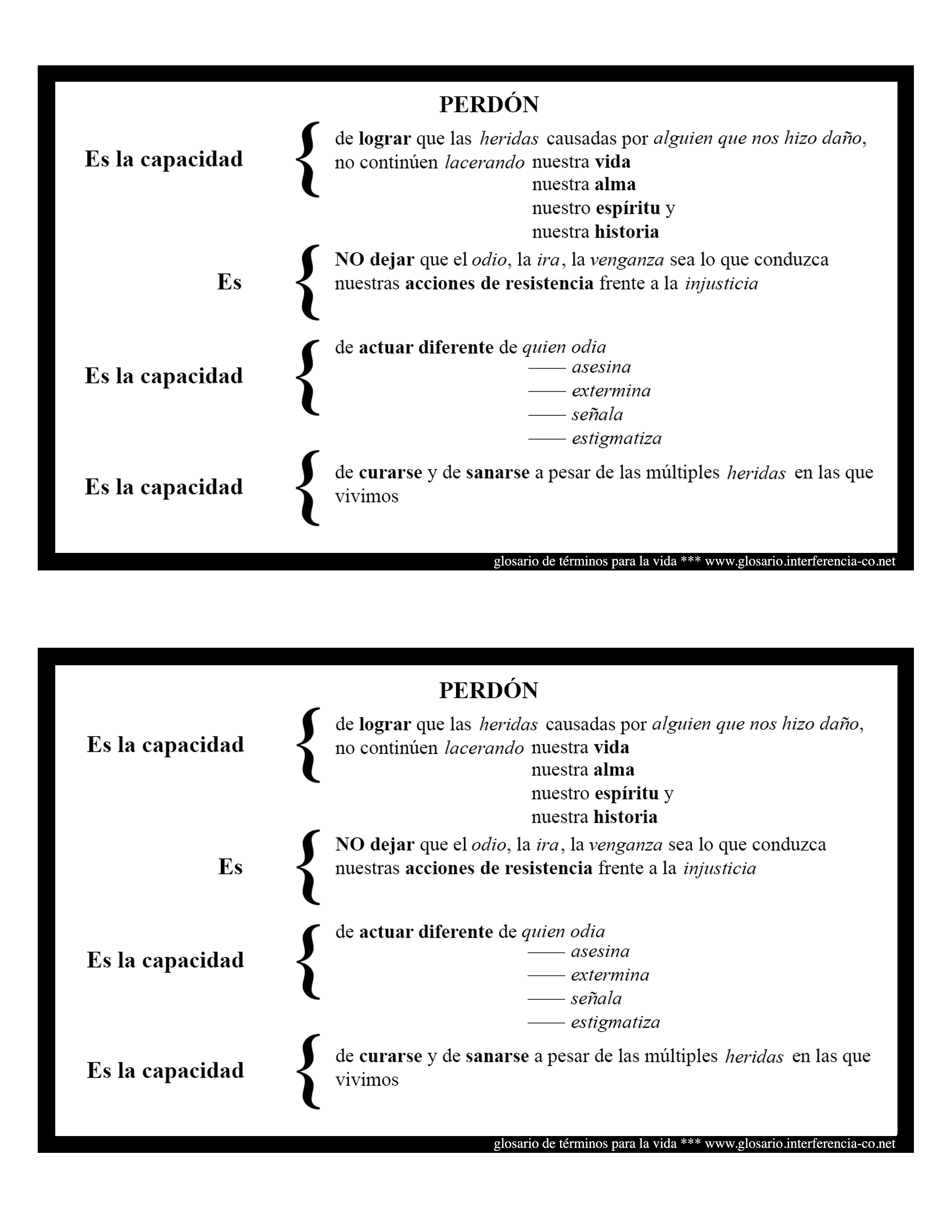 perdón traducido por Henry Ramírez Soler cmf, quien es un valiente misionero claretiano y defensor de DDHH, que impulsado por la Teología de la Liberación, aporta sin descanso a la paz en Colombia desde la construcción de la verdad, acompañando a comunidades campesinas víctimas de la violencia y a familiares de personas que han sido desaparecidas en el marco del conflicto, en los procesos de búsqueda identificación y entrega digna.
